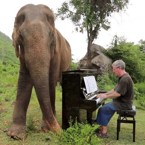浪漫月色下,59岁的钢琴家Paul为一只大象弹奏贝多芬《月光奏鸣曲》。一曲终了,这只61岁的老象Mongkol,竟掉了眼泪。在这之前,他是一位空降BBC,忙于世界巡回演出的知名钢琴家;它曾经遭受虐待,身体严重变形,右眼被戳瞎,一根象牙被活活砍断。在过去的十年间,无数大象被人类奴役,伐木拖树、开山运石。那些因为积劳成疾而丧失劳动能力的大象,只能面临被主人贩卖,拔掉象牙,谋取暴利的命运。许多大象更因为伤口严重感染而死,最后幸存下来的,仅仅只有25只。人类手握冰冷的尖刀,大象陆续倒下,一个,一个,又一个……2011年,在泰国生活了25年的英国钢琴家Paul,偶然听说了大象的故事。妻子没犹豫,马上着手安排。同样作为艺术家的她,深知人类亏欠大象太多。如果音符能够为历经人间炼狱的大象带来半分温暖,那么无论如何,他们都要让这些孩子们带着希望活下去。经历了长久的杀戮和虐待之后,大象对人类早已失去信任,单剩下恐惧。他将钢琴搬到草原里,在敲下第一个琴键之前,他问自己:如果这是我一生当中,唯一一次为它们演奏的机会,那我应该弹些什么?他静默良久,轻抚琴键,一首贝多芬的《悲怆奏鸣曲》由指尖缓缓流出。身边原本狼吞虎咽吃草的一头大象,突然静静定在原地,嘴里还含着咀嚼到一半的叶子。身边工作人员看到了这一幕,激动大叫:“天哪!他在听……”它叫Plara,曾经在森林运输木材时,因为意外被树枝刺伤眼睛,导致失明。“失业”之后,主人砍去它的象牙,它的伤口也因此严重感染。纵使双目失明,可Plara的眼睛却闪闪发着光,余生的企盼,他为它找到了。从那以后,他们同吃同睡,清晨早起给大象弹轻快乐曲,深夜为它们弹奏晚安曲……Plara偏爱慢节奏的古典乐,每当Paul弹钢琴或吹长笛时,它都会弯曲着鼻子,轻轻触碰他的手臂。“它经常感到痛苦,我想也许音乐在黑暗中给了他些许安慰。”一人一象,相见恨晚。这场双向奔赴的救赎,虽迟但到。2012年,Plara死于细菌感染,它日日思念的家,再也回不去了。只是每天弹奏他们初遇时的那首《悲怆奏鸣曲》,一遍又一遍。伤恸划破长空,这场大地上最悲壮的葬礼,没有来宾……Plara的离开,让 Paul一度以为,再不会有观众。直到,他遇到了另一位“没礼貌”的听众——Peter.一天下午,Paul正在树下独自弹琴,一头年轻的大象从身后向他“突袭”。对音乐,它很有主见,甚至开始对Paul“指手画脚”。弹得兴奋了,它会拿鼻子敲Pual的脑袋,好像在说:“这里应该这么弹。”那一刻,他突然觉得,Plara还在,它们从未离开。Paul惊讶地发现,原来Peter才是那个“天才艺术家”。他还精通绘画,和Paul玩起各种即兴涂鸦,这下,Peter玩疯了……他们常常一起做着世界上最浪漫的事,一人一象,形影不离。第一次听到音乐的小象开心起舞,冲上来毛茸茸地撒娇。那一刻,Paul在心中祈祷,希望小家伙永远不要长大,或许永远都不会遭受虐待和猎杀。在大象成员中间,一只名叫Romsai的大象很有个性,对音乐也有自己的坚持。每当他听到琴键上贝多芬的旋律响起,便会用鼻子拱一拱钢琴,好像在说:若换一首舒伯特的曲子它会走得远远的,根本糊弄不了它。他脾气暴躁,常常打伤同伴,脖子上拴着的红绳,预示着“危险勿近”。这一世,它没逃过悲惨的命运,双眼全盲,后腿重伤,象牙被连根拔起。琴键上响起贝多芬《命运交响曲》,它停止嘶吼,陷入沉默。月光星空下,萤火轻扬,Paul带着钢琴来到Romsai面前,演奏起一首《安眠曲》。突然,这位70岁高龄的老朋友突然“轰”一声睡下,鼾声四起。这是Romsai第一次,没有防备地,像个孩子般沉沉睡去。Paul轻抚着它的身体,口中呢喃:很抱歉,很抱歉……每个月,Paul都会带着家人去“大象世界”做义工。他们一起给大象弹琴、喂它们早餐、帮它们洗澡、准备食材……有时,女儿Emilie会坐在他膝盖上,一起为大象弹二重奏。她记得每一只大象的名字,记得他们的习惯,和所有爱吃的食物。她眼含星光:我爱你们,我愿意像爸爸一样,一直一直,守护下去。大手和小手,在琴键上轻轻跳跃,那一刻,Paul好想再对死去的Plara说一句:更不会忘记那些残损的身体,砍断的象牙,破败的伤口,逝去的生命……这是渴望夺回失地的被放逐者们,与无情猎杀的“文明”之间的较量吗?