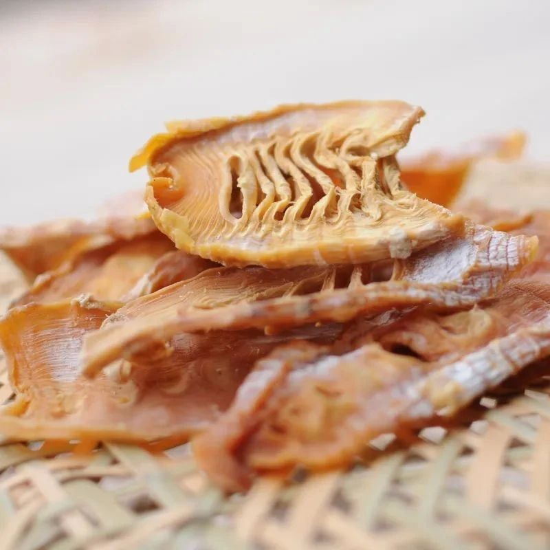 泡好的笋,还要进行切片、晒干,这才终于有了我们看到的闽北笋干。制作过程不熏硫磺、无添加,所以笋干呈现自然的棕黄色。表面会有一层淡淡的白粉是笋箾,这是制干过程,笋自身含有的碱性物质脱水析出形成的,并不是发霉,不影响食用。