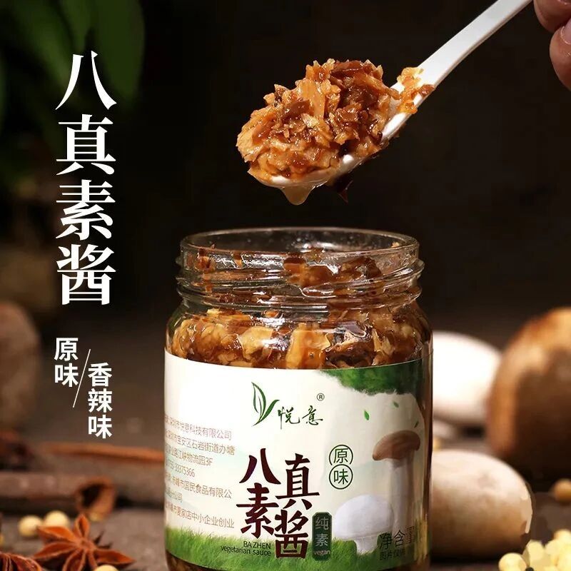 人长大了总免不得要离家,远离父母求学的学子,在外打拼的打工人,远离了家乡的旅人……在异乡的饭菜总有不合胃口的,这时总会想起妈妈做的纯天然酱菜!因为市面上许多酱菜都难逃食品添加剂,即使因为嘴馋买了也总是不放心!今天素小编给大家推荐一款无添加宝藏好酱--【悦意】八真酱,它酱香醇厚、味道鲜美,只需一小勺,便能让一碗平淡的白米饭或一碗清水面条瞬间有了鲜活的味道。【悦意】八真酱的“八真”指的是八种主要配料:杏鲍菇、非转基因大豆蛋白、非转基因大豆油、草原白蘑、姬松茸、猴头菇、花生碎、葵花籽仁。