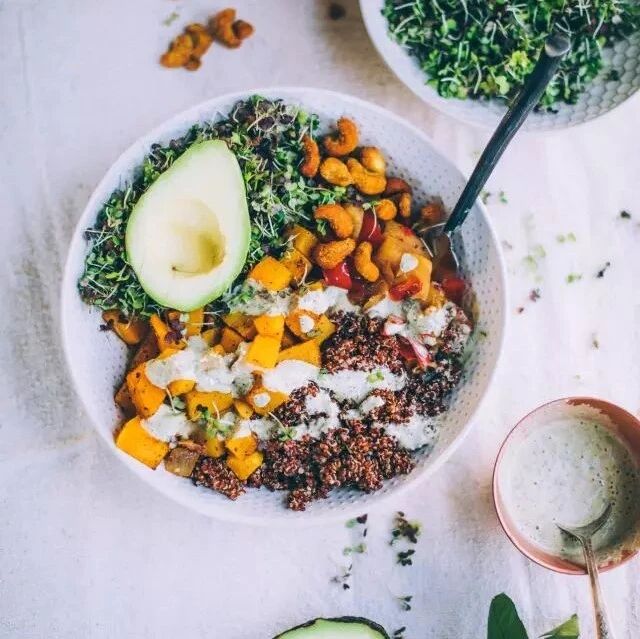 日复一日吃一些清淡玩意,到最后会怀疑人生:我活成这样和兔子有什么区别?但Buddha Bowl却能让人充满食欲。首先它是满满的一碗,显得很有元气的样子;其次它的配色很鲜艳,一看就觉得很有营养的样子。而自己制作它的过程,就彷如一个仪式,告诉自己:我要准备开动了哦,让我瘦成一道闪电吧!粗粮主要包括谷物类(玉米、小米、红米、黑米、紫米、高粱、大麦、燕麦、养麦等)、杂豆类(黄豆、绿豆、红豆、黑豆、蚕豆、豌豆等),以及块茎类(红薯、山药、马铃薯等)。粗粮含有丰富的不可溶性纤维素,有利于保障消化系统正常运转。增加食物在胃里的停留时间,延迟饭后葡萄糖吸收的速度,降低高血压、糖尿病、肥胖症和心脑血管疾病的风险。医学研究还表明,纤维素有助于抵抗胃癌、肠癌、乳腺癌、溃疡性肠炎等多种疾病。蛋白质的主要来源是豆类食品。其中以黄豆的营养价值最高,它是婴幼儿食品中优质的蛋白质来源;此外像芝麻、瓜子、核桃、杏仁、松子等干果类的蛋白质的含量均较高。蛋白质是组成人体一切细胞、组织的重要成分。机体所有重要的组成部分都需要有蛋白质的参与。一般说,蛋白质约占人体全部质量的18%,最重要的还是其与生命现象有关。包括叶子类、十字花科、根茎类等。孔子说“不时,不食”,意思是,不是这个季节的东西就不吃。中医经典着作《黄帝内经》也说要“食岁谷”,就是要吃时令食物。豆瓣酱、有机沙拉酱、香菇酱、花生酱、芝麻酱、和风酱、泰式酱等,就可以自制一份健康午餐啦!