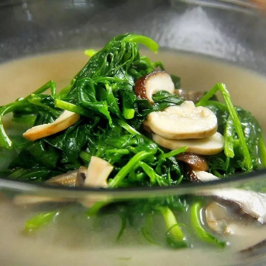 在日常生活,每天三餐都离不开的蔬菜,是人们生活中最熟悉的食物之一。我们对蔬菜太熟悉了,却早已忽略了蔬菜的价值。所谓时蔬一定要吃应季,不时不食,当季的蔬菜无需过多的加工,轻轻水煮后食用会吃出淡淡的蔬菜甜味,慢慢体会那舒畅的感觉,欣喜油然而生!② 锅中放油烧热,将切好的香菇和口蘑倒入锅中煎至两面微黄,蘑菇出水。④ 用小火慢慢熬炖10分钟,加少许盐调味,倒入碗中。⑤ 烧一锅开水,将豌豆苗倒入锅中焯至变色后即可捞出,保持翠绿。⑥ 将炒好的豌豆苗放入碗中,浇入菌菇汤。就可以吃啦!
