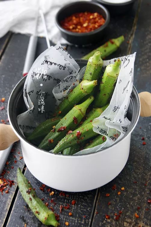 秋葵400克,盐1茶匙,椒盐1汤匙,黑胡椒1茶匙,辣椒面1汤匙