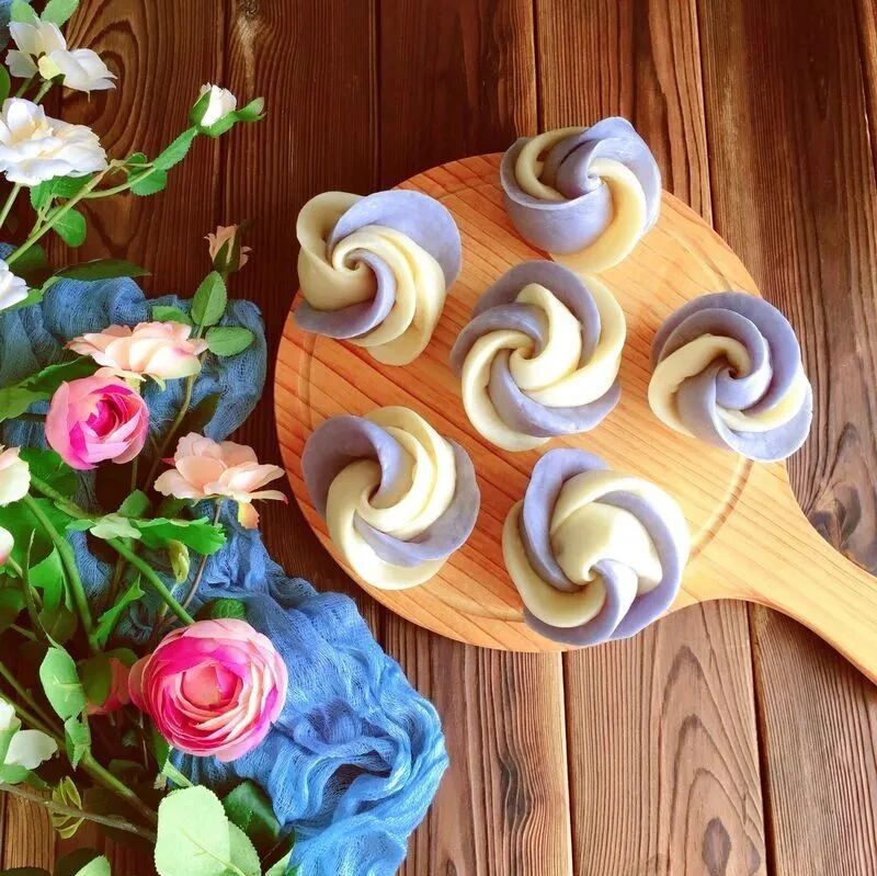 馒头不只是方方正正的形状,做之前卷一下,吃了几十年的馒头就能大变样啦,今天小编来教大家做美美的玫瑰花馒头!首先把发好的面团,先擀成方形,切成一样大小的正方形块,差不多五张面皮叠一起,用筷子从中间压一下,再卷起来。卷好的面团从中间切一刀,再把面团的“花瓣”拨开一些,这样花朵就成型啦。用绿色的菠菜面团切成长三角,放在花朵的底部做绿叶陪衬,蒸出来的玫瑰花馒头简单又漂亮,上桌人人夸!1、将紫薯蒸熟用勺子压成泥状,再与面粉混合,加入酵母水和白糖揉成紫色面团,等待发酵;再用同样的方法揉出一个白色的面团备用;2、将两种面团搓成条,切成一样大小的面剂子,擀成圆片;3、用我们上面一样的玫瑰花卷法,白色面皮和紫色面皮相间,用筷子从中间压一道痕再卷起来;4、 从压痕中间用刀切开,整理一下玫瑰花瓣的形状,然后就可以拿去上锅蒸啦。面粉500g,紫薯泥150g,南瓜泥100g,酵母6g1、南瓜和紫薯提前用蒸锅蒸熟。切小块,入蒸锅,水开后蒸20分钟就差不多了。;3、蒸南瓜的时候,先用面包和出一个白面面团。面粉200克,加入酵母2克,水80克用面包机搅拌和面一个程序就可以;4、然后在用面包机和南瓜面团直接发酵。南瓜含水量很大,不同的南瓜含水量还不一样,南瓜面团我没有加水,直接就用南瓜泥100克,加面粉150克,酵母2克和成,自己做的时候根据半挂的含水量酌情加面粉,软硬度和白面团差不多就行,然后一边手揉紫薯面团。紫薯面团用了酵母2克,紫薯150克,面粉150克,加了一点水;5、待面团发酵至原来的1.5至2倍大时就可以i操作,先取出面团排气;6、每样面团都做成大小相等的面剂子,剂子的大小可根据个人喜好决定;7、取一个剂子,擀成中间厚四周薄的面片。将另一个颜色为不同的面剂包裹于其中;9、用刀沿着面饼的周边均匀地切出刀口,中央保留不要切断,成花瓣状。将一圈都切好,切得要尽量均匀;10、将花瓣一瓣一瓣地顺着一个方向旋转,稍作整形;12、整形好的馒头放进蒸锅进行二次发酵大约20分钟后上锅蒸制,上汽后20分钟制熟,蒸熟后不要着急开锅,焖5分钟在开锅。动手小达人不妨试试用南瓜面团来做一朵菊花,色彩鲜艳令人食欲满满!1、做一个南瓜面团和白面团备用,面粉中加入白砂糖和酵母,加入捣烂的南瓜泥,揉成面团进行发酵;2、取一份南瓜面团揉成圆饼状,再包上一份白色的面团,和搓汤圆一样,最后压成饼状,这样白色的夹心层就有了。然后用刀切成12份,注意中间不能切断;3、把切好的面团边扭一下,露出白色的夹心层,最后再用模具压出一朵菊花,把它放到大花瓣上去装饰,如何DIY出美美的花瓣,完全可以大胆发挥你的想象力南瓜泥100克、酵母3克、原蔗糖15克、中筋面粉150克、盐2克、植物油5毫升1、把所有材料混合在一起,揉成面团,接着揉成长条,揉长向内覆盖,这样的动作连续做三次;2、把面团擀成一个椭圆形,注意厚薄均匀,如果有气泡,可以用牙签刺穿;3、用茶杯口在上面印上6个圆花胚,这几个花胚的大小最好差不多,把花胚放进塑料盒存入冰箱里面,延缓发酵;4、把做花胚剩下的面团中加入可可粉,指尖稍微沾点清水,继续揉面团,让可可粉和面团混合均匀,接着也放入冰箱,延缓发酵;5、把花胚拿出来,用一个口径小于茶杯的塑料杯往下压;6、开始做太阳花造型了,用剪刀剪两下,捏一下,把六个都做好;7、把加有巧克力粉的面团擀成椭圆形,用之前用过的塑料杯印出几个圆形,要把圆的边整理好,看起来更光滑;8、用刀在圆面上画上竖条和横条,做成向日葵中间的样子;9、把向日葵拼凑完整,放在蒸笼里面发酵30分钟,然后上锅用中火蒸20分钟就可以了。水510毫升、酵母3克、原蔗糖23克、中筋面粉300克、盐2克、植物油8毫升2、一份面团中加入红曲粉,一份面团中加入南瓜粉,一份面团中加入菠菜粉;4、开始做绣球造型:先按照下图,把四种长条摆成#字型;5、由3点钟位置开始,顺时针方向,隔条向下覆,做一圈,由6点钟位置开始,逆时针方向,隔条向下覆,做一圈;6、顺时针方向,粘合面团末端,一定要把口捏住,最后就成了一个漂亮的绣球,发酵30分钟,蒸20分钟就可以吃了。
